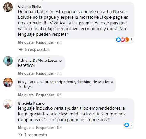 "Inclusivo es que esté escrita en braile para los no videntes y pictórico para los autistas también. Lo otro es una paparruchada para calcular cuántos idiotas siguen al gobierno", disparó el usuario Oscar Eltiti. "Lenguaje inclusivo sería ayudar a los emprendedores, a los negociantes, a la clase media, a los que siempre nos rompimos el culo para pagar los impuestos", se quejó por su parte la cibernauta Graciela Pisano.