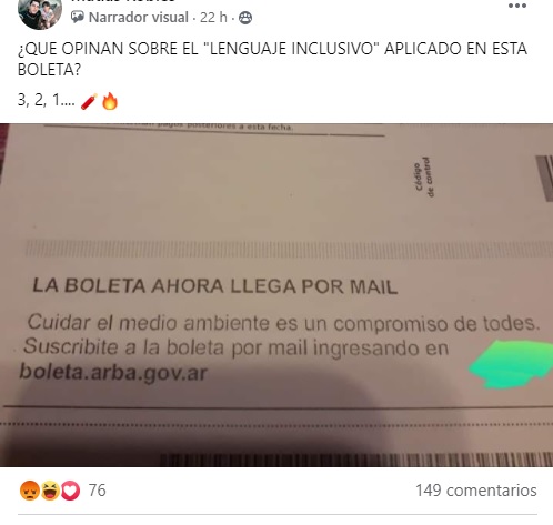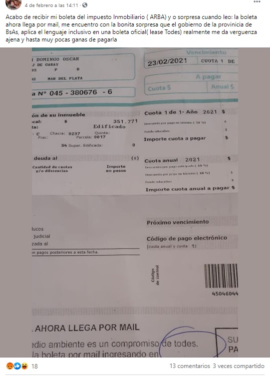 Como era de esperar, gran cantidad de bonaerenses manifestaron su descontento en las redes sociales. "Acabo de recibir mi boleta del impuesto Inmobiliario y ¡oh sorpresa! cuando leo: "Me encuentro con la bonita sorpresa que el gobierno de la Provincia aplica el lenguaje inclusivo en una boleta oficial. Realmente me da vergüenza ajena y hasta muy pocas ganas de pagarla", señaló Oscar Boich en su cuenta de Facebook.