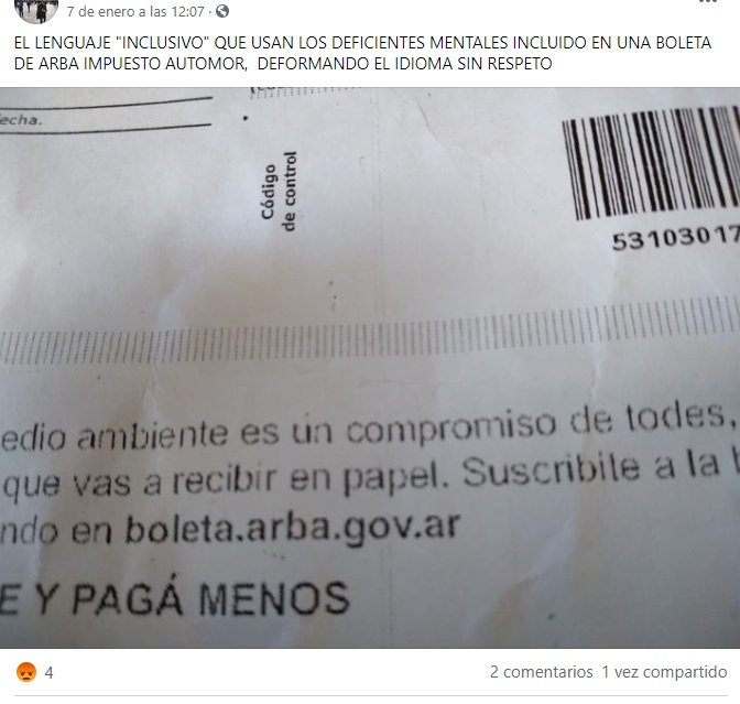 Sin previo aviso, en el corriente mes de febrero la Agencia de Recaudación de la Provincia de Buenos Aires (Arba) comenzó a emitir sus boletas con la utilización del llamado lenguaje inclusivo. Miles de contribuyentes se encontraron con la sorpresa de que en las facturas de los impuestos inmobiliarios y automotor, entre otros comenzaron a llegar con la leyenda: "Cuidar el medio ambiente es un compromiso de todes".