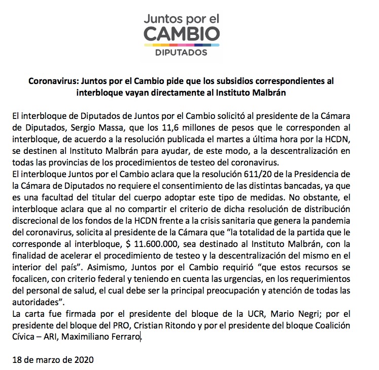 Los diputados nacionales de Juntos por el Cambio piden que los 11,6 millones de pesos que corresponden a su interbloque sean destinados al Instituto Malbrán que realiza los test de detección del Coronavirus. El dinero es administrado por los legisladores pero pertenece a los contribuyentes.