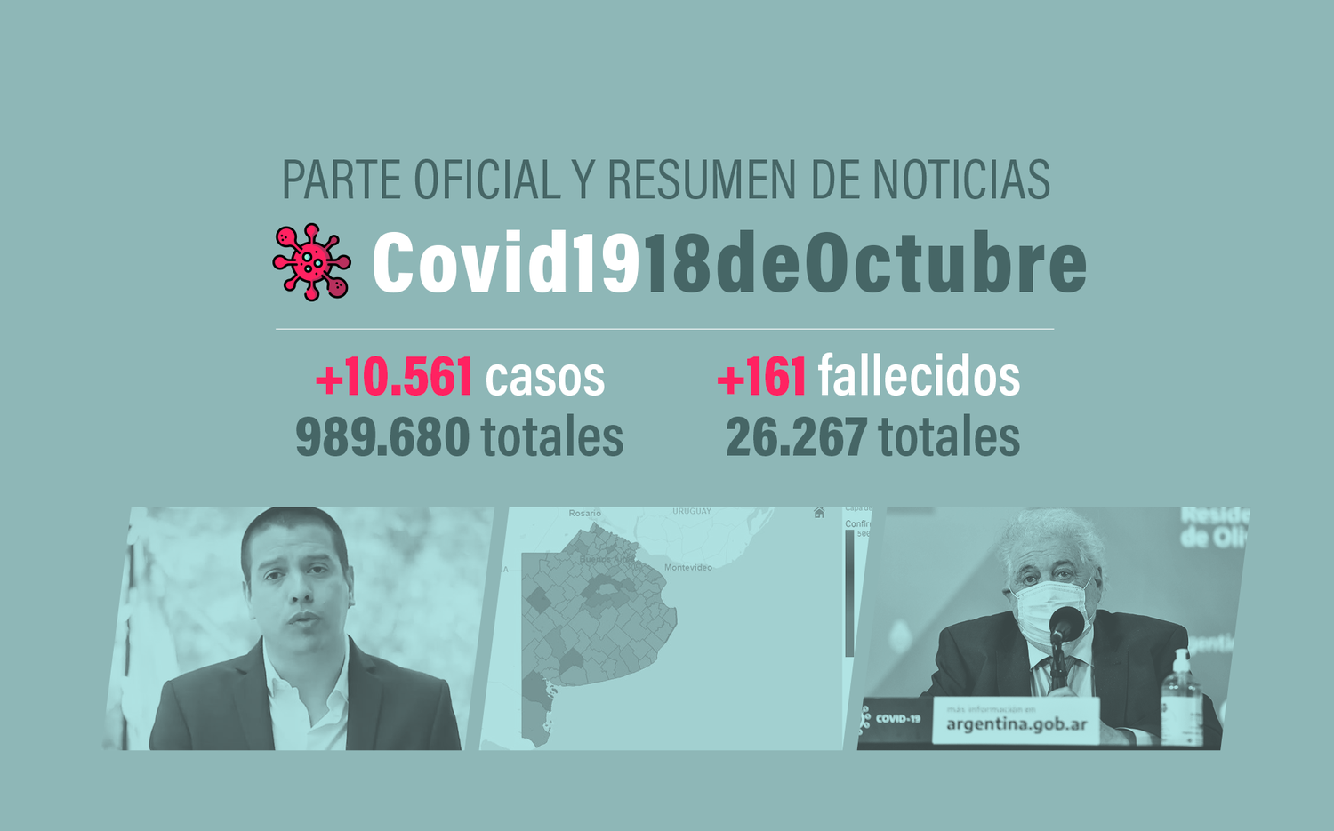 La Argentina tiene 989.680 casos positivos de Coronavirus y sumó 10.561 en el país. De ellos 2.383 pertenecen a la provincia de Buenos Aires, lo que acumulan 498.251 en total en este territorio, según el parte del 18 de octubre.