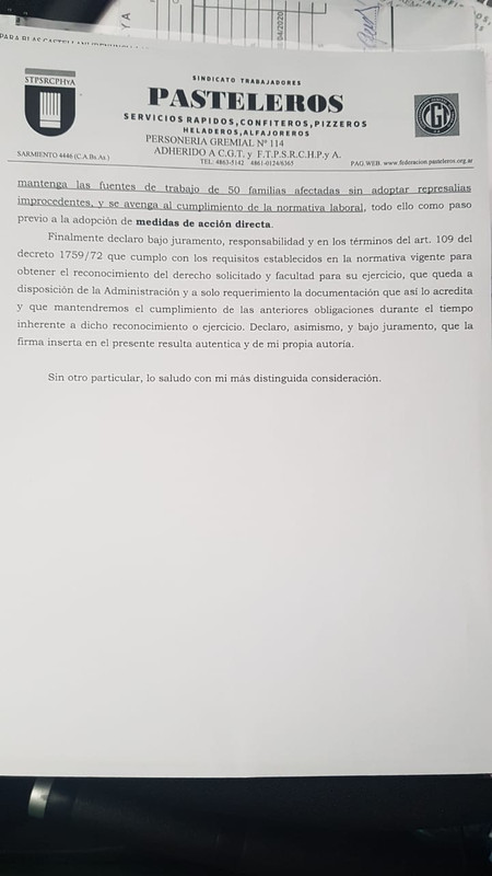 "Son 50 familias afectadas por la conducta indolente de la parte empresaria que se niega a dar respuestas y mantener un diálogo para intentar desentrañar la penosa situación de los compañeros", sostuvo Gasso. Por último, Pasteleros denunció una maniobra lamentable: Tras la inspección, el propietario obligó a 8 trabajadores a firmar la desafectación de la empresa ante escribano público asegurándose que no se activen reclamos en su contra.