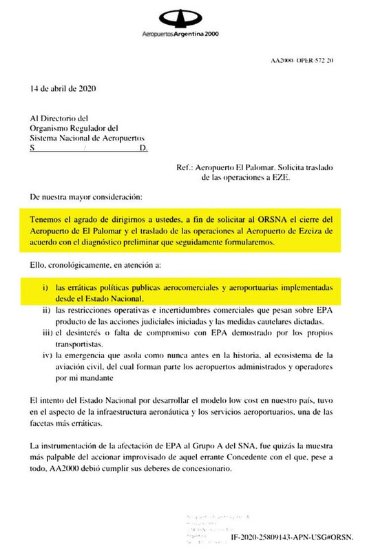 A través de una carta firmada por los apoderados de la compañía, los ejecutivos de Aeropuertos Argentina 2000, la concesionaria de la estación aérea de El Palomar, solicitaron al Orsna (Organismo Regulador del Sistema Nacional de Aeropuertos) el cierre del Aeropuerto de El Palomar y el traslado de las operaciones al Aeropuerto de Ezeiza".