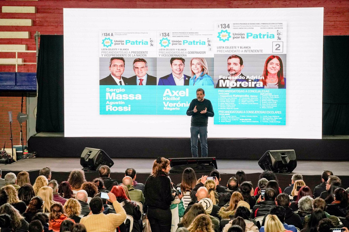 “Hoy comienza la campaña”, dijo Moreira ante unas 1500 personas en el club Alemán ubicado en 9 de Julio y Márquez. En su alocución que duró poco más de media hora, el precandidato hizo foco en la baja participación electoral, llamó a militar la boleta completa que encabezan Sergio Massa y Axel Kicillof y no hizo ninguna mención a la interna local, en la que se medirá con el otro postulante de UxP, con Leonardo Grosso.