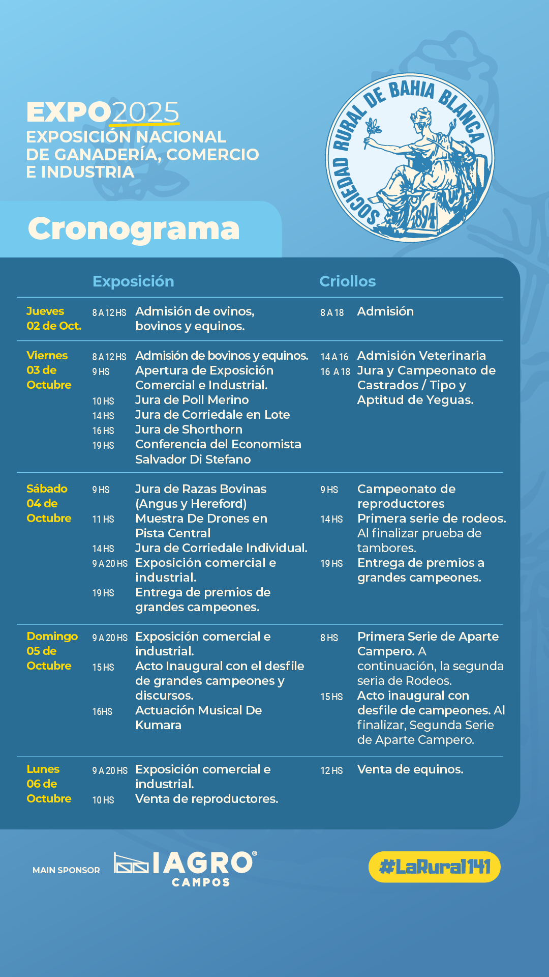 - Descripción: Exposición Nacional de Ganadería, Comercio e Industria, con charlas técnicas, prueba de criollos, maquinarias, feria de stands, gastronomía y productos típicos de la región, espectáculos y actividades para toda la familia. Entrada gratuita el viernes y el lunes. Domingo, $8000. Menores de 12 años, gratis. Organiza la Sociedad Rural de Bahía Blanca. Cronograma: http://www.sociedadruralbb.com.ar/.../2025/09/cronograma.png