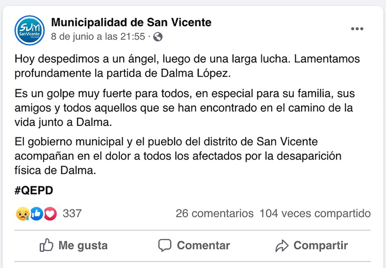 En ese sentido, desde la Municipalidad de San Vicente despidieron a la pequeña en redes sociales pero no hicieron mención al coronavirus. "Hoy despedimos a un ángel, luego de una larga lucha. Es un golpe muy fuerte para todos, en especial para su familia, sus amigos y todos aquellos que se han encontrado en el camino de la vida junto a Dalma", apuntaron desde la Comuna en Facebook.