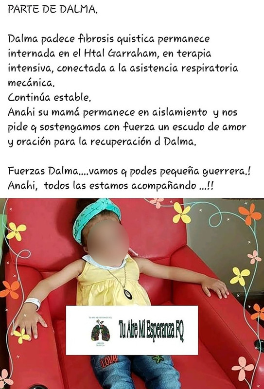 Desde la Asociación Argentina de Fibrosis Quística habían iniciado una cadena de oración por Dalma. Según trascendió, la mamá de la nena, Anahí Morel, también contrajo el virus y, mientras su hija estaba internada en terapia intensiva con asistencia respiratoria mecánica, ella permanecía en aislamiento. LaNoticia1.com intentó contactarse con el Hospital Garrahan, pero desde la Institución no brindaron declaraciones.