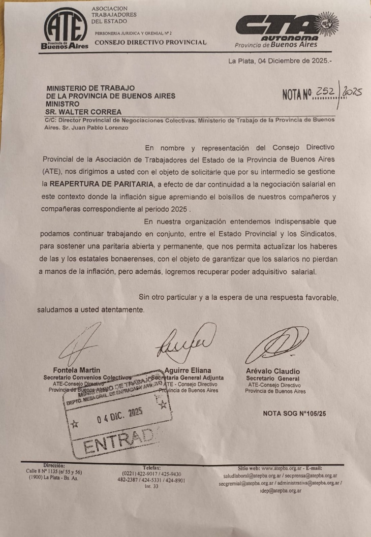 Se trata de ATE. "Necesitamos seguir recomponiendo nuestro poder adquisitivo, ya que venimos perdiendo por las políticas del gobierno nacional", señalan en la carta dirigida al Ministro de Trabajo.